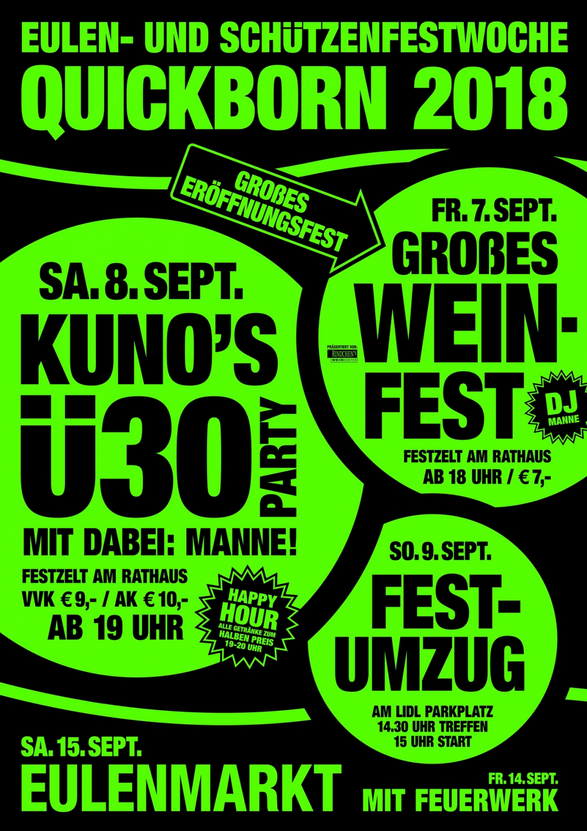 Samstag, 8. September Ü-30-Party mit Kuno. Mit dabei: Manne 19.00 Uhr - Festzelt auf dem Rathausplatz Veranstalter: Schützenverein Quickborn-Renzel von 1928 e.V. Kostenbeitrag: 9,- € im Vorverkauf und 10,- € an der Abendkasse |